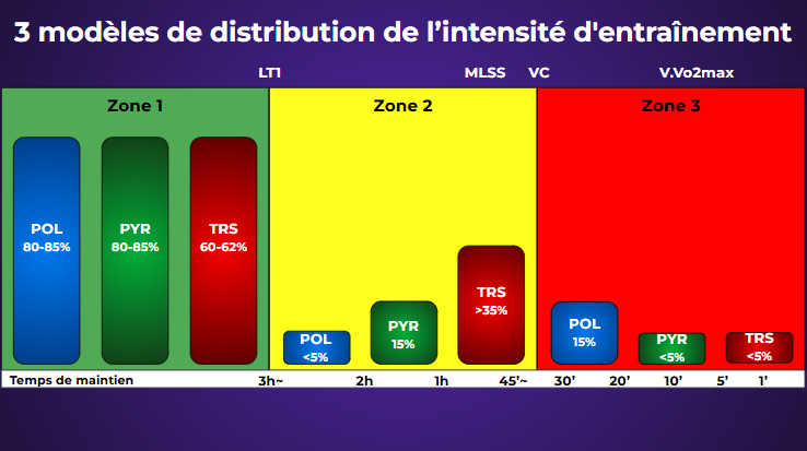 Depuis plusieurs années, la distribution de l’intensité de l'entraînement est au cœur des débats dans les sports d’endurance. Aujourd’hui, deux types de modèles semblent les plus répandus. Les deux se caractérisent par un volume à basse intensité en zone 1 important (80%), c’est la distribution du pourcentage à haute intensité qui va les différencier. Le modèle polarisé prône environ 5% en zone 2 (domaine lourd/modéré) et 15% en zone 3 (domaine sévère/intense), le modèle pyramidale sera l’inverse (15% en zone 2 et 5% en zone 3).